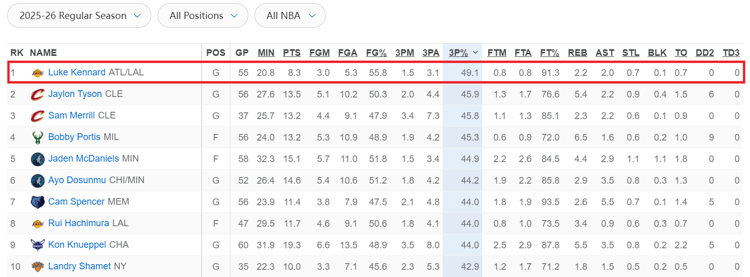 肯纳德打出了投篮180俱乐部的表现——投篮命中率50%以上,三分命中率40%以上,罚球命中率90%以上。在本赛季的三分命中率榜上,肯纳德高居第一。骑士队的泰森以45.9%排名第二,梅里尔45.8%排名第三,波蒂斯以45.3%排名第四,杰登·麦克丹尼尔斯以44.9%排名第五。