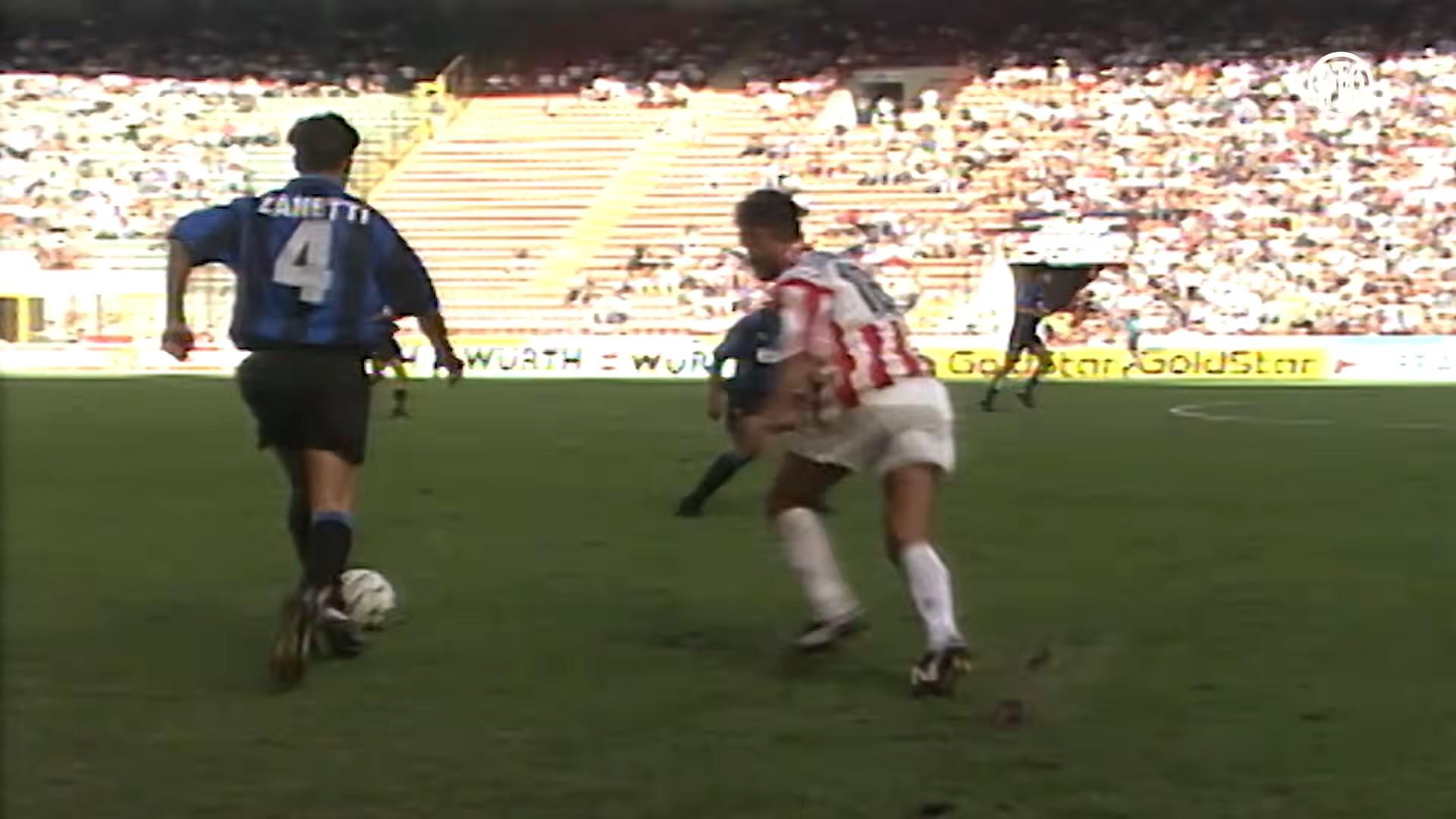 1995年8月27日,国米对维琴察,我的首秀。那天是梦想成真的日子,在圣西罗8万人面前出场,还赢了球,罗伯托-卡洛斯进的球。那是我们一起到来的第一年,那场比赛的呐喊声将永远留在我心中。我当时绝不会想到,我会为国际米兰出战858场比赛。
