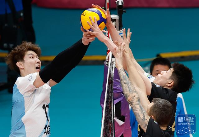 ↑ 保定沃隶队球员隋翔宇、康斯坦丁、辛尼察(前排从左至右)在比赛中拦网北京北汽队球员江川。新华社发(马子涵摄)