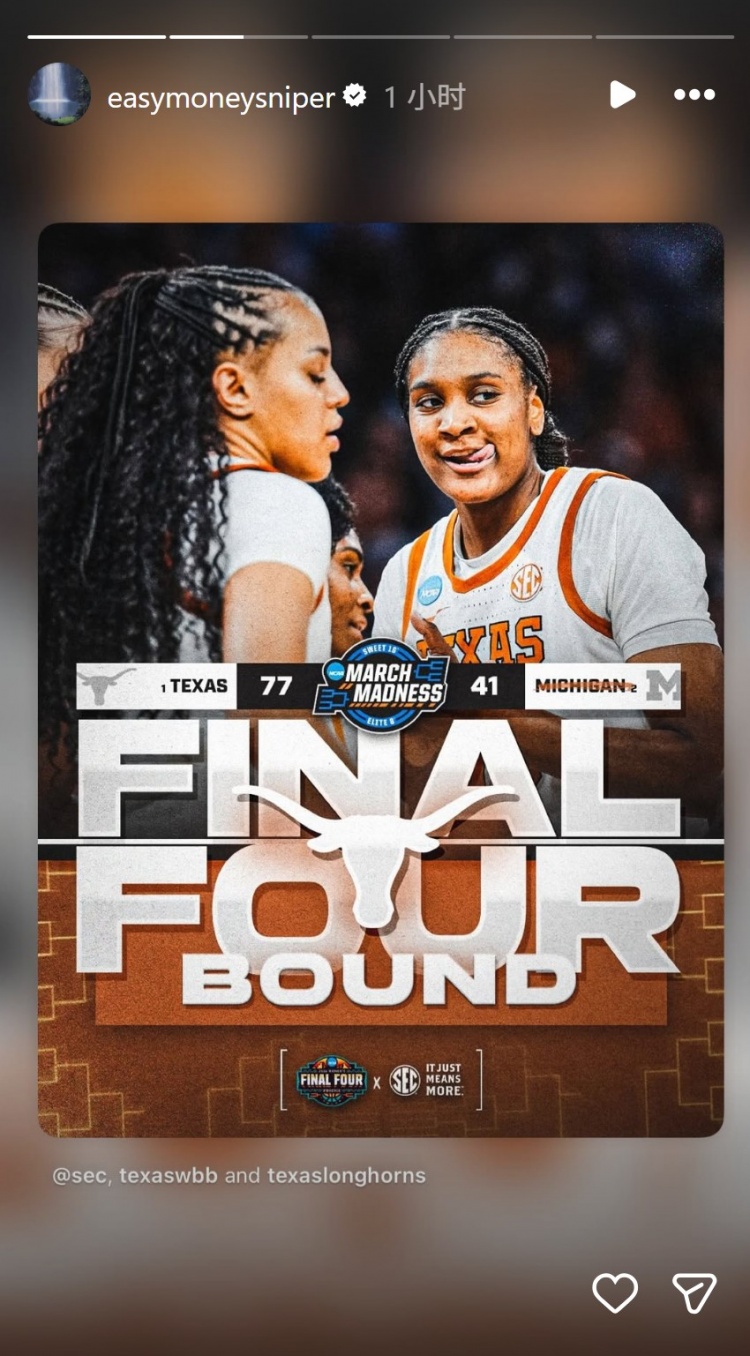 3月31日讯 今日NCAA女篮1/4决赛,德克萨斯大学77-41大胜密歇根大学,晋级四强。